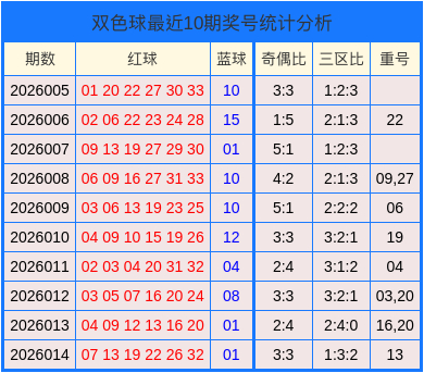 开奖回顾:双色球第2026014期奖号:07、13、19、22、26、32+01。其中奇偶比为3:3,三区比为1:3:2,开出1枚重号13。